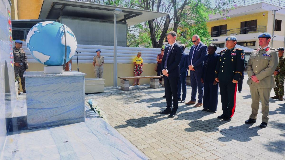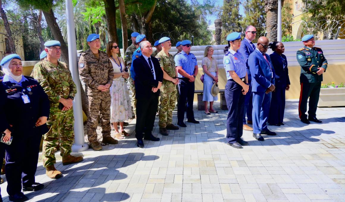 This morning, the Special Representative of the Secretary-General in Cyprus, Colin Stewart, accompanied by UNFICYP’s senior leadership and peacekeepers from its military, police, and civilian components, held a solemn event at the Ledra Palace Hotel to pay tribute to the work of peacekeepers in Cyprus and around the world.